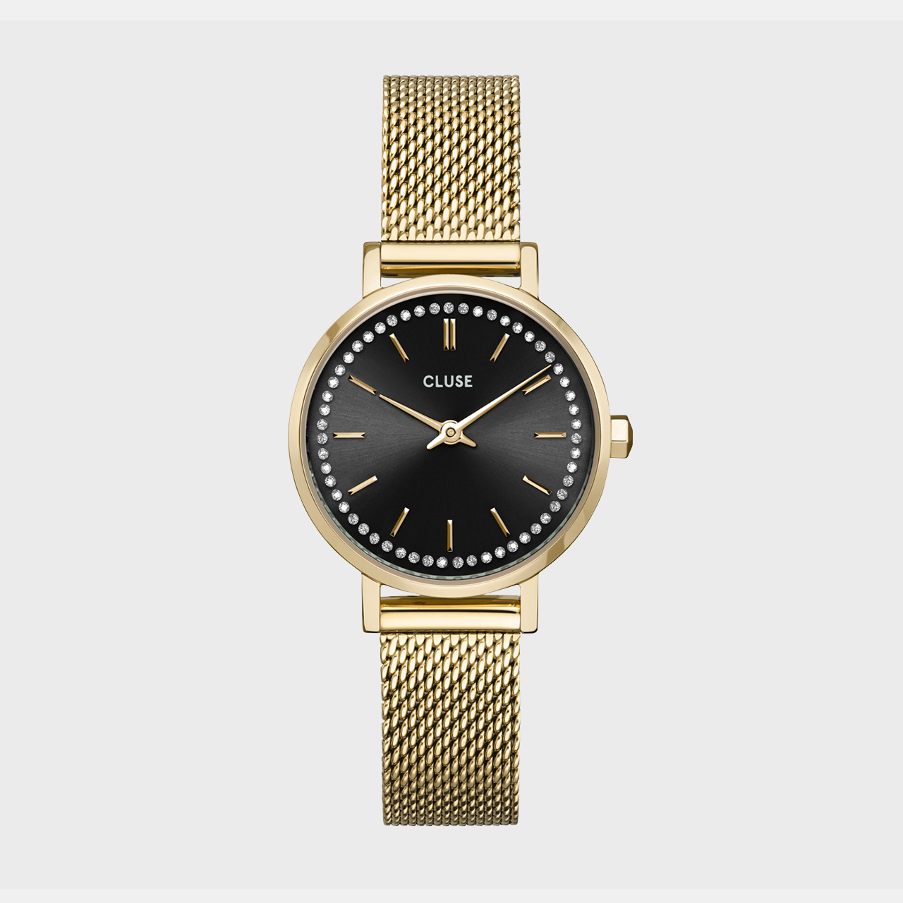 Cluse Boho Chic Petite Womens Watch with Gold Steel Case, Black Dial with Crystals and Gold Stainless Steel Mesh Strap CW10501