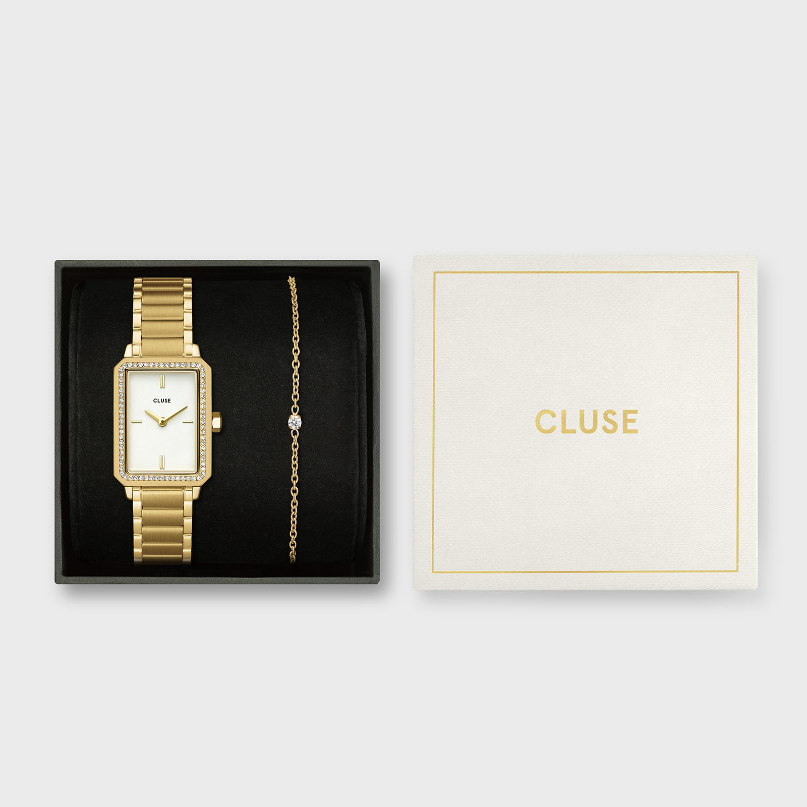 This CLUSE gift box for women combines the Fluette women's watch with the gold coloured Chain bracelet. The Fluette watch features a white coloured dial, 30.6 mm case with cubic zirconia stones and 3-link stainless steel strap. Pair the watch with the complementary gold coloured bracelet.