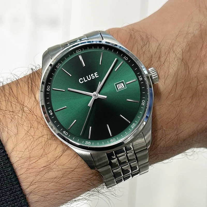 Discover our new men's watch collection - the epitome of style, quality and value. With sleek designs and durable construction, these pieces combine sophistication and modernity. With a 41 mm brushed and polished silver stainless steel case and green sunray dial the ANTHÉOR takes center stage on your wrist. Its 20 mm wide silver stainless steel strap complements the case, creating a harmonious and sleek design that effortlessly blends with any outfit. To adjust the strap and change the battery, we recommend visiting your local jeweler.