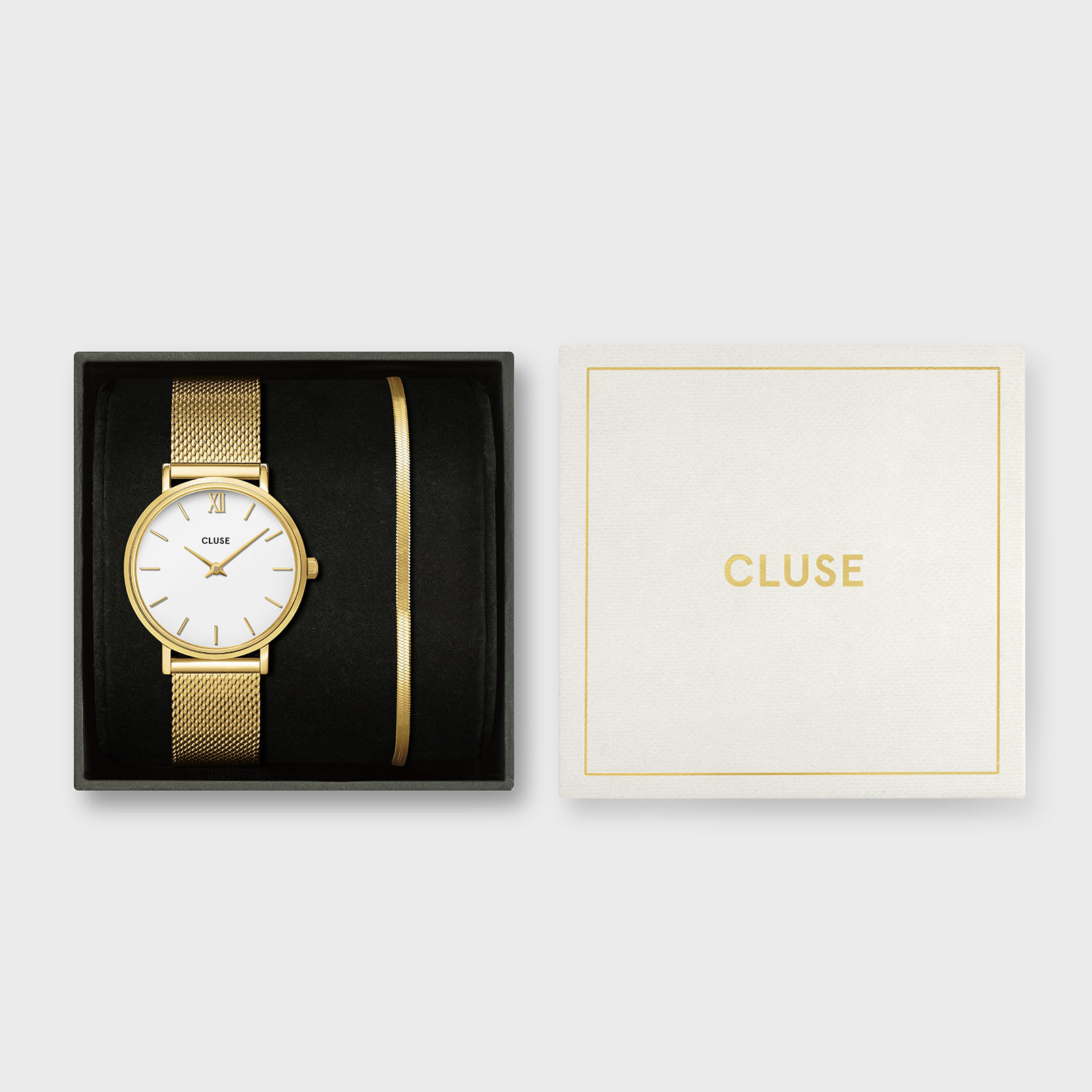 This CLUSE gift box for women combines the Minuit women's watch with the gold coloured Flat Snake bracelet. The Minuit watch features a white dial, 33 mm gold coloured case and mesh stainless steel strap. Pair the watch with the complementary gold coloured bracelet.